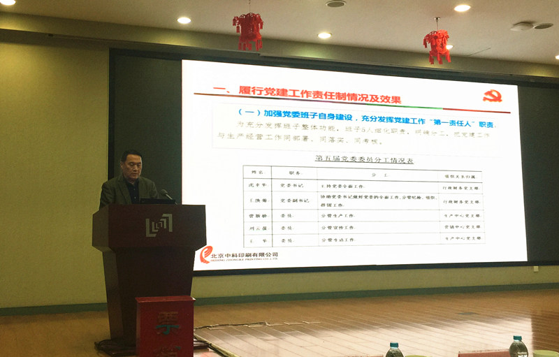 2018年1月22日,京区企业2017年度党建工作述职报告会在文献情报中心一层报告厅进行。我公司党委书记、董事长沈幸华同志代表中科印刷就2017年度的党建工作做了述职报告。